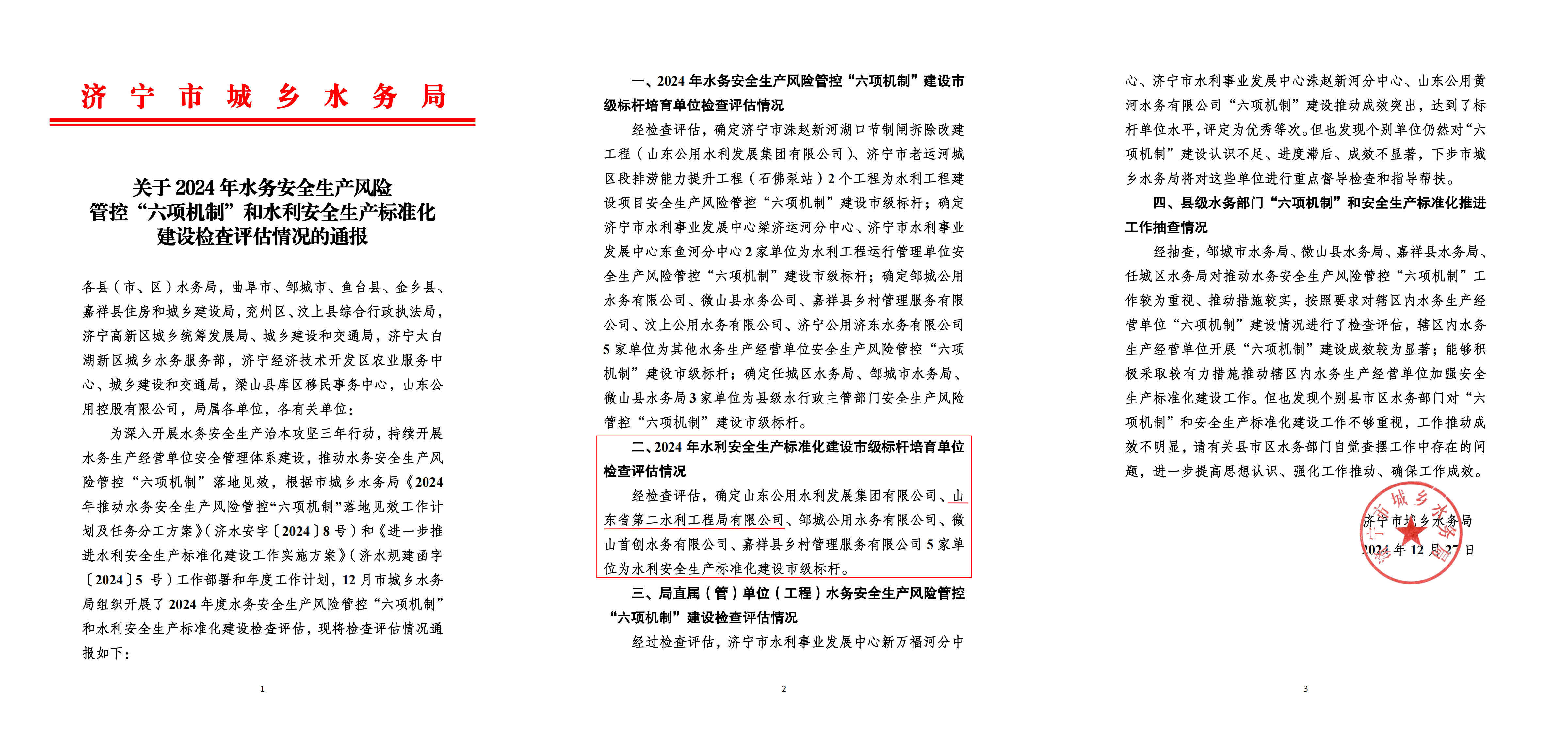近日,济宁市城乡水务局公布了2024 年水务安全生产风险管控“六项机制”和水利安全生产标准化建设检查评估情况,经检查评估,二局有限米兰平台.米兰(中国)_米兰平台.米兰(中国)被评为水利安全生产标准化建设市级标杆企业。