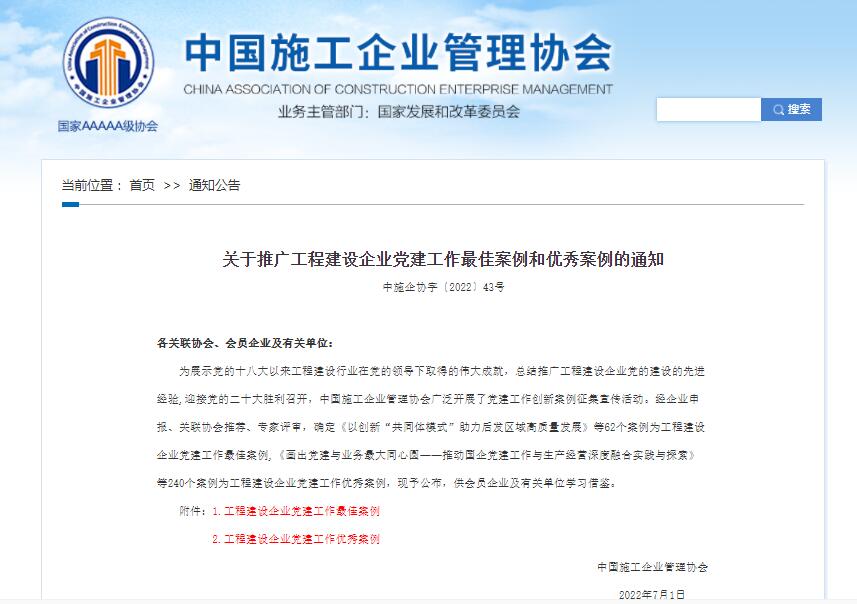为展示党的十八大以来工程建设行业在党的领导下取得的伟大成就,总结推广工程建设企业党的建设的先进经验,迎接党的二十大胜利召开,近日,中国施工企业管理协会组织开展了工程建设企业党建工作优秀案例评审工作,米兰平台.米兰(中国)_米兰平台.米兰(中国)第六分米兰平台.米兰(中国)_米兰平台.米兰(中国)党支部的《塑品牌抓活动促活力 切实提升党建工作水平》案例获评“工程建设企业党建工作优秀案例”。